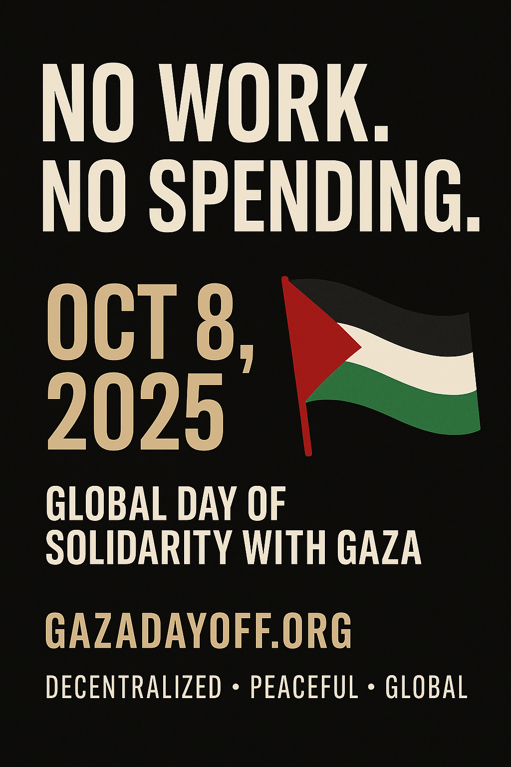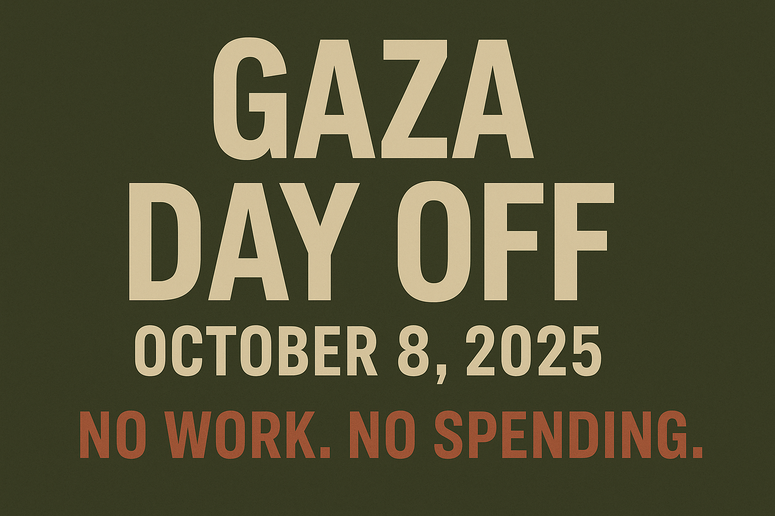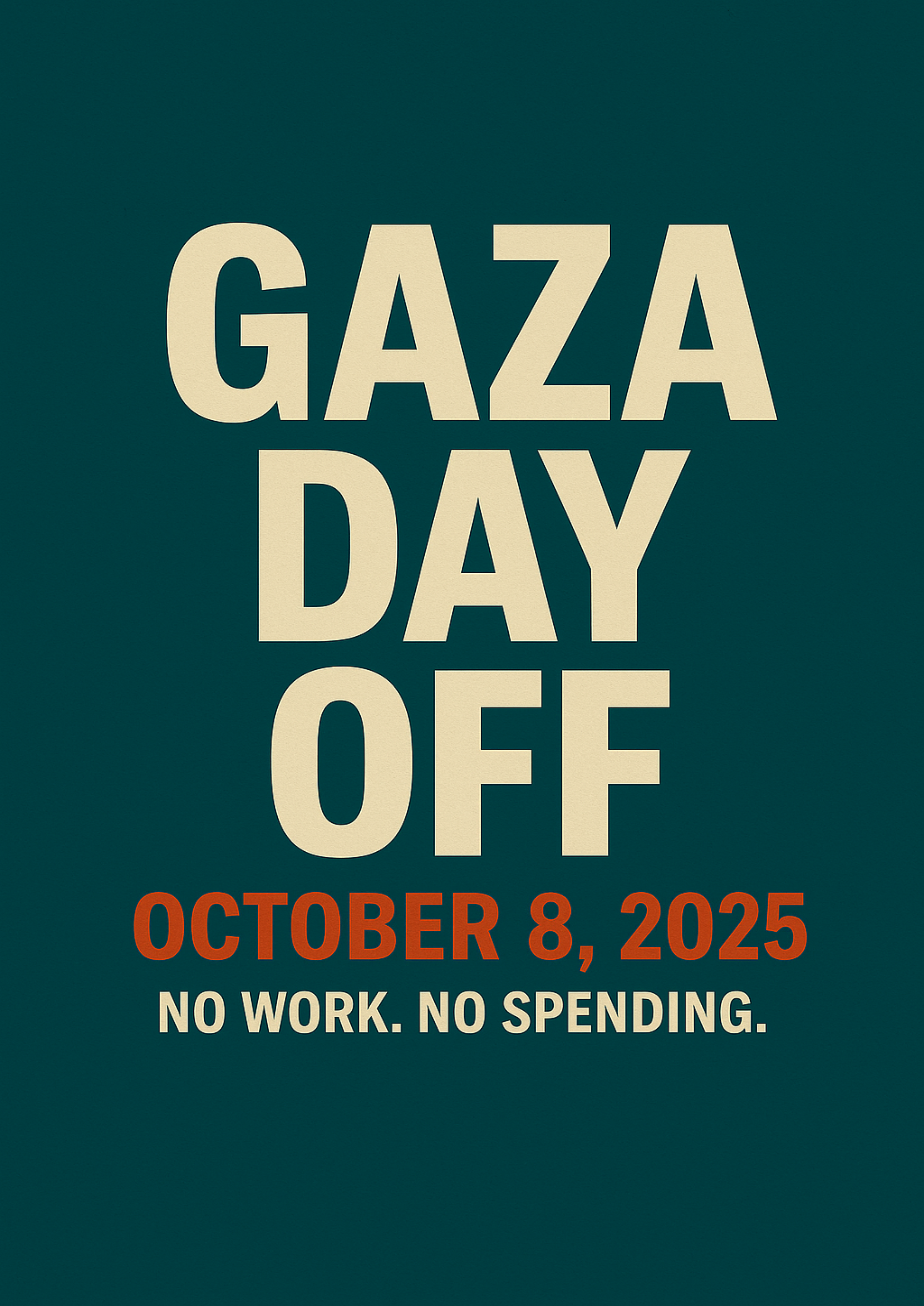 - Tell 3 friends. Post: “Gaza Day Off — Oct 8: No Work. No Spending.”