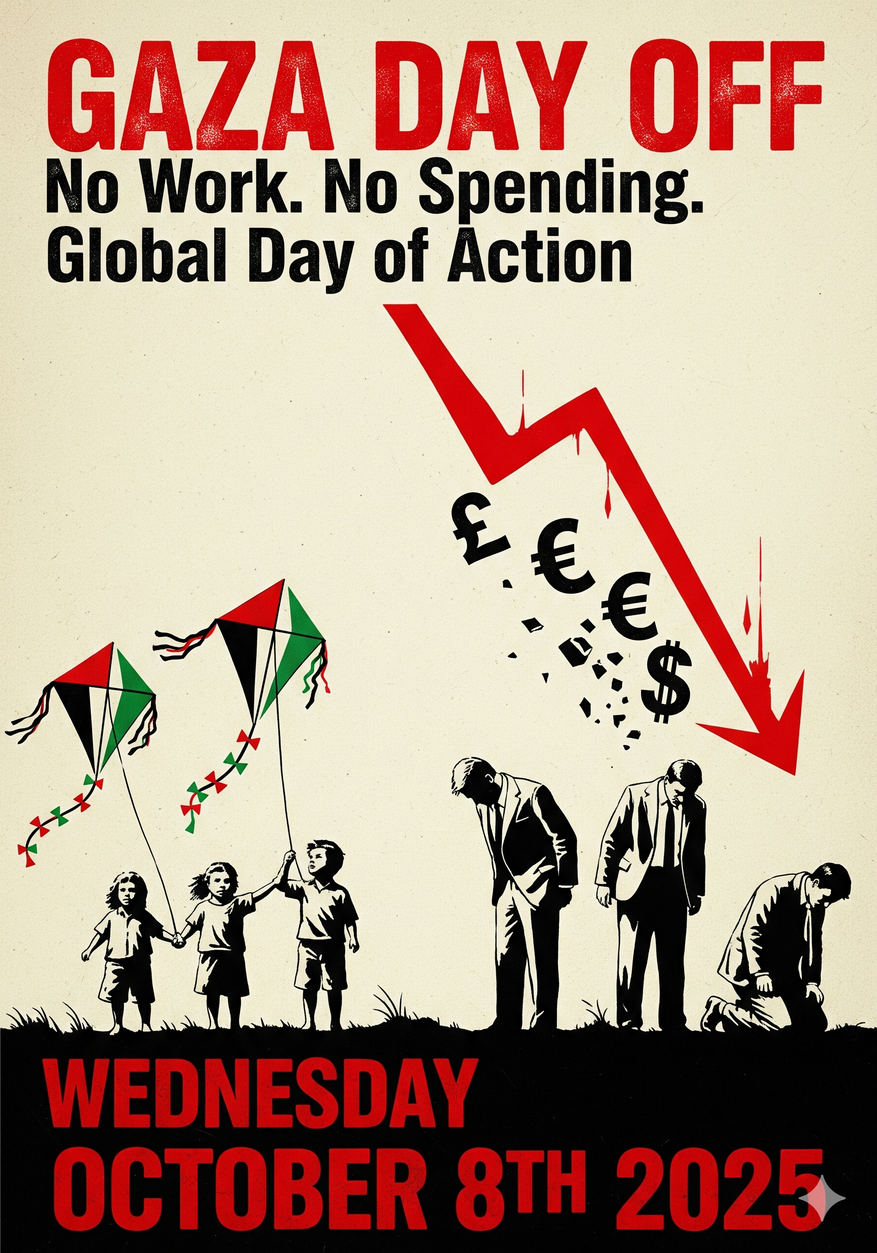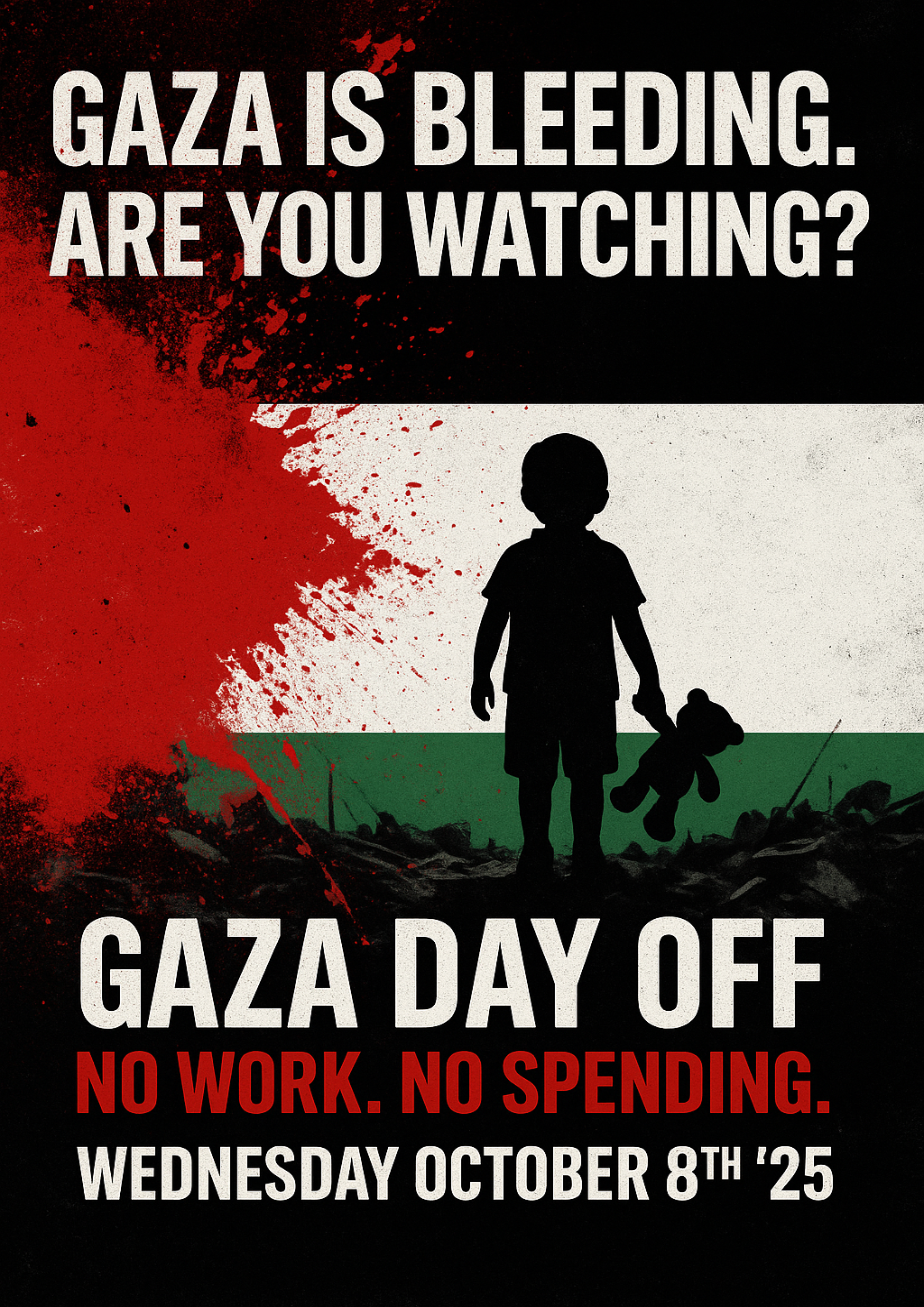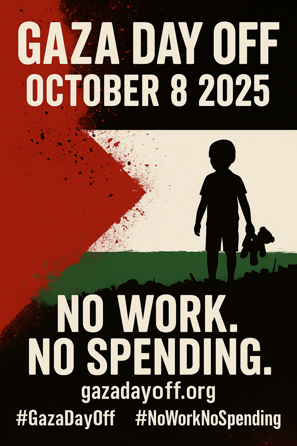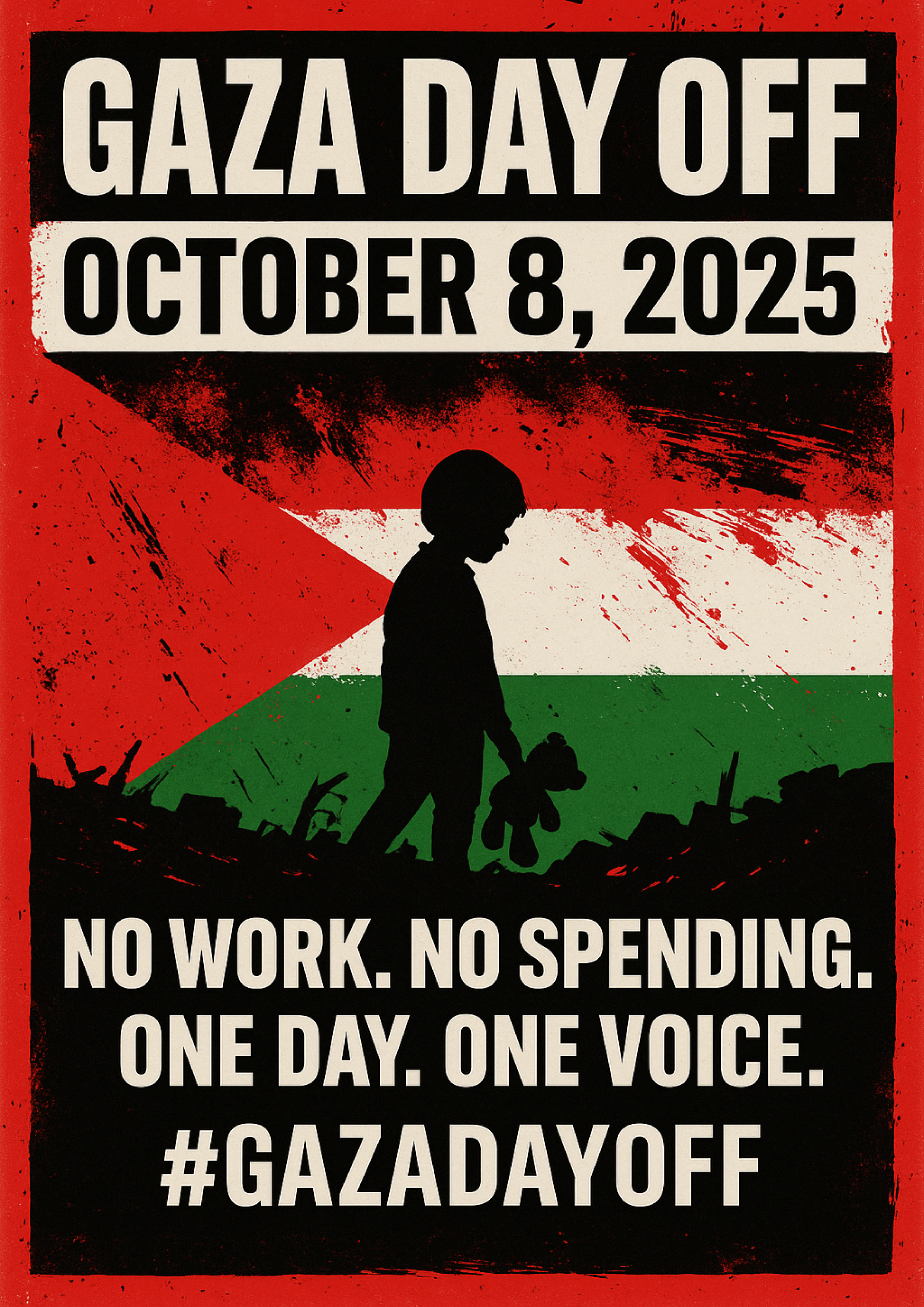 - Tell 3 friends. Post: “Gaza Day Off — Oct 8: No Work. No Spending.”